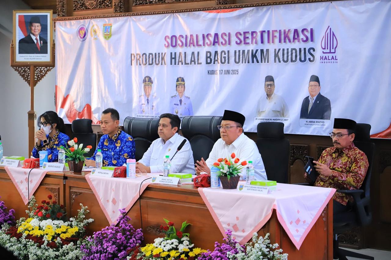 Imbauan tersebut disampaikan langsung oleh Bupati Kudus, Sam’ani Intakoris, saat membuka Sosialisasi Sertifikasi Produk Halal bagi UMKM yang digelar di lantai IV Gedung A Sekretariat Daerah Kudus. Menurutnya, kualitas UMKM tak hanya dinilai dari produksi dan pemasaran, tetapi juga dari komitmen dalam menjamin keamanan dan kehalalan produk.